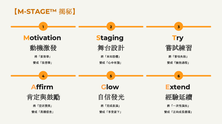 我帶大家認識米可吉他的舞台教育三部曲,並用 M-STAGE 理論(動機 → 舞台設計 → 嘗試 → 肯定 → 發光 → 延續)貫穿理念。